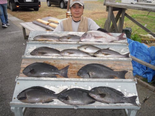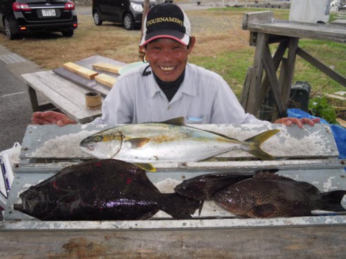 | ①クロ46㎝~40㎝ 1,6㎏~1,1㎏ 5枚 イサキ43cm~37㎝ 1,0㎏~0,7㎏ 6枚 マダイ55㎝ 1,8㎏ 1枚 ②ヒラス62㎝ 2,3㎏ ヒラメ55㎝ 1,6㎏ オオモンハタ40㎝と33㎝ 1,1㎏と0,5㎏ 2枚 | |