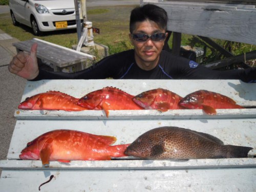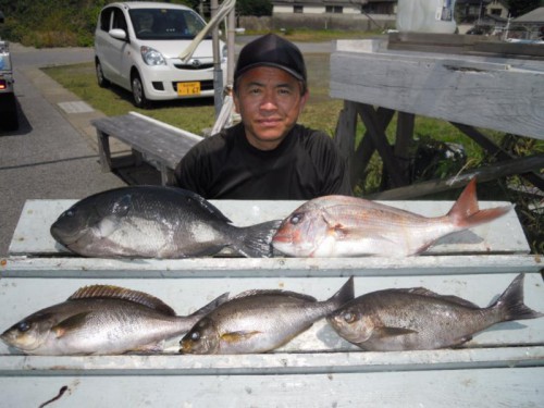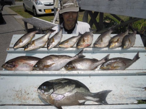 | ①ルアーにて。 アカハタ40㎝~30㎝ 1,0㎏~0,4㎏ 5枚 オオモンハタ45cm 1,2㎏ 1枚 ②イサキ38㎝~30㎝ 0,7㎏~0,5㎏ 12枚 オナガ45㎝ 1,8㎏ 1枚 ③イサキ42㎝~40㎝ 1,0㎏~0,8㎏ 3枚 マダイ50㎝ 1,5㎏ 1枚 グレ45㎝ 1,9㎏ 1枚 | |