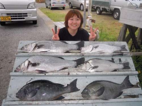 | ヒラスズキ65cm~50㎝ 2,5㎏~1,0㎏ 4本 グレ47㎝と45cm 1,6㎏と1,5㎏ 2枚 | |