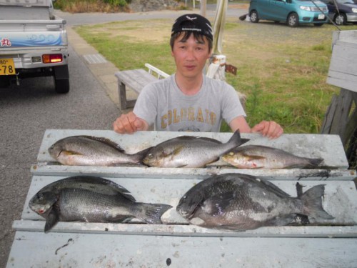| マダイ65cmと60cm 3,4㎏と2,1㎏ 2枚 イサキ37㎝と33㎝ 0,7㎏と0,5㎏ 2枚 チヌ45cm 1,5㎏ 1枚 | |