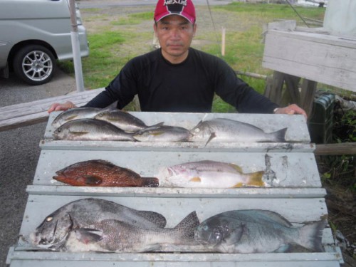| コロダイ54㎝ 2,2㎏ グレ44㎝ 1,4㎏ イサキ40㎝~28㎝ 1,0㎏~0,3㎏ 5枚 | |