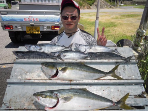 | ①ヤズ66㎝ 2,8㎏ 1本 ハガツオ48㎝~45㎝ 1,0㎏~0,8㎏ 10本 ②ヤズ68㎝と65㎝ 3,3㎏と2,7㎏ 2本 ハガツオ47㎝~45㎝ 1,0㎏~0,7㎏ 5本 | |