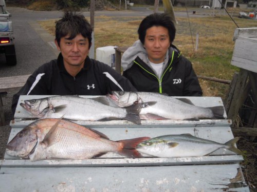 | マダイ61㎝ 2,5㎏ ヒラスズキ65cmと60cm 2,8㎏と1,8㎏ 2本 ヤズ50㎝ 1,2㎏ | |
