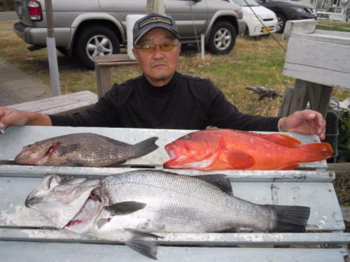 | ヒラスズキ75㎝ 4,5㎏ 1本 アカハタ50㎝ 2,0㎏ オオモンハタ40㎝ 1,3㎏ | |