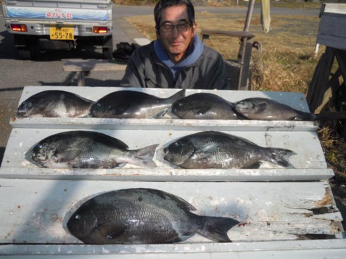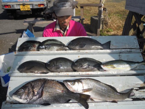 | ①グレ40㎝~33㎝ 1,0㎏~0,5㎏ 6枚 チヌ52㎝ 2,2㎏ 1枚 ヒラスズキ53㎝ 1,7㎏ ツムブリ40㎝ 0,8㎏ ②グレ47㎝~37㎝ 1,7㎏~0,8㎏ 7枚 | |