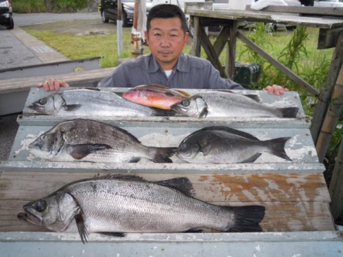 | ヒラスズキ75㎝~45㎝ 3,6㎏~1,2㎏ 4本 ハマイサキ30㎝ 0,4㎏ クロ43cm 1,2㎏ チヌ48㎝ 1,7㎏ | |